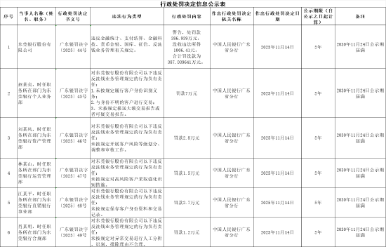 据金融前线11月26日报道,根据中国人民银行广东省分行行政处罚决定书信息公开表,东莞银行股份有限公司违反金融统计、支付、金融科技、金银币、金库、征信、反洗钱经营管理等相关规定,因非法获利行为被警告,并被罚款3,869,390,000元。0元。没收1,006.41元,罚款总额为3,870,396.41元。